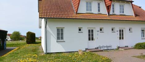 Die Wohnung im Erdgeschoss eines alten Reetdachhauses ist landschaftlich hübsch und verkehrsberuhigt gelegen. Für spontane kurze Ausflüge ist man schnell zu Fuß durch den schönen Wald am Steinstrand. Allerdings ist die Küche extrem klein, die Ausstattung ist rudimentär und sehr verbraucht. Das zur Verfügung gestellte Doppelbett bestand aus Campingbett Konstruktionen, die Rollos und Gardinen schon arg verschlissen, das Sofa mit Hundehaaren verschmutzt und total verbraucht. An sich eine niedliche Wohnung aber leider etwas gammelig. Die im Haus befindliche Gastherme oder Heizungsanlage machte ununterbrochen ein unüberhörbares Geräusch, das auch draußen im Garten Bereich nicht zur Entspannung beitrug. Zu dem fehlten die schönen weißen Gartenbänke, die auf den Katalogfotos zu sehen sind. Immerhin wurde der defekte Wasserkocher zeitnah ersetzt. Unsere Empfehlung an den Betreiber lautet, die Bude mal zu renovieren und eine ordentliche Ausstattung zu organisieren, z.B. Töpfe, Bett, Sofa, Küchenschränke. Außerdem sollte die lärmende Heizanlage gedämmt werden.