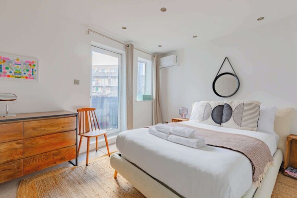 Sink into the calming comfort of this cosy master bedroom after a day of adventure! Have a peaceful night's sleep in the comfortable double bed adorned with crisp hotel-quality linen and enjoy plenty of storage space to keep your belongings tidy. There is even a handy air conditioning unit available, perfect for balmy summer evenings. And with a door opening out to the private balcony, natural light pours into the space, allowing you to enjoy the bright morning light and warm evening glow from the bedside lamp from this lovely space.