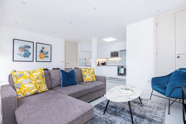 This fourth-floor flat features three spacious double bedrooms, each thoughtfully designed for relaxation and equipped with comfortable double beds. Guests will appreciate the convenience of three bathrooms, two with baths and wall-mounted showers, and one featuring a walk-in shower. The open-plan living and dining area is a bright and inviting space that boasts a comfortable grey sectional sofa adorned with vibrant mustard-yellow and deep-blue accent pillows, creating a cheerful pop of colour. The plush blue armchair adds an additional cozy seating option, while the minimalist design, complete with a marble-effect oval coffee table and abstract art pieces, enhances the contemporary aesthetic. There is an inviting, outdoor seating area, perfect for enjoying a morning coffee or unwinding after a busy day. The kitchen is equipped with modern appliances and glossy white cabinetry, complemented by soft under-cabinet lighting, making it both stylish and functional.