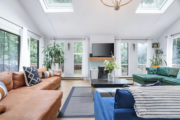 Welcome to Green Acres Nature Escape, a spacious 3-acre private retreat nestled in the serene woods of the Pocono Mountains. This eco-friendly property offers cozy interiors with modern amenities, making it perfect for romantic getaways, family adventures, or solo retreats. Enjoy the luxurious hot tub, gather around the fire pit, and let the kids explore the playhouse. The large deck with a grill is ideal for outdoor dining and relaxation.