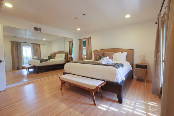 - To the left is a spacious living room with comfy seating and a surround sound to watch your favorite movies or sports. Attached to the living room is a large open space filled with dinning room with an 8 person table and kitchen. We have 2 guest bedrooms one with a king bed also has a private patio to seat and enjoy your coffee, the other with a full size bed and a twin. There is a guest a bathroom available in the hallway. There is an added private bedroom that could be occupied from time to time.