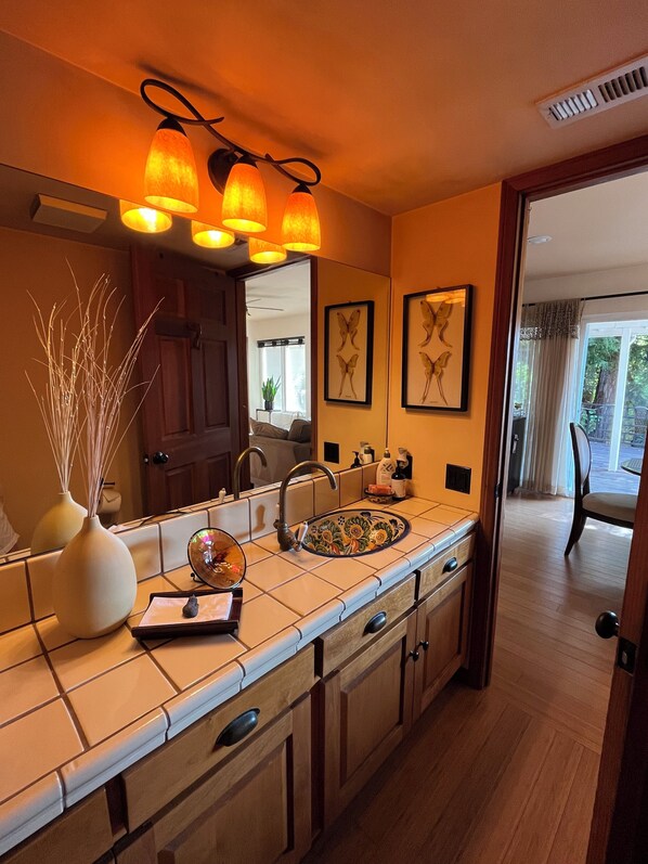 Al piano superiore c'è una grande camera da letto principale con il proprio bagno privato a due lavandini con vasca e una cabina doccia aperta, in fondo al corridoio ci sono due camere da letto matrimoniali con accesso a un altro bagno completo fuori dal corridoio. Al piano inferiore troverete un ampio soggiorno confortevole completo di camino e un pianoforte a coda per bambini. I pavimenti sono rifiniti con piastrelle Saltillo nei salotti e nelle sale da pranzo e assi di bambù in cucina e nella camera familiare. La camera familiare dispone di una smart TV Roku da 48 "con Netflix e Amazon. C'è un dispositivo Google Home e Wi-Fi ad alta velocità. La cucina è ben fornita con un bagno 1/2 adiacente al piano di sotto. Grande ponte da 65 'all'esterno con una vasca idromassaggio Grandee da 500 galloni, una buca per il fuoco al propano, giardini sconnessi, barbecue e una grande casa sull'albero! Panorami mozzafiato dappertutto. Gli animali domestici sono ammessi secondo la nostra politica. Abbiamo un grande cortile recintato.