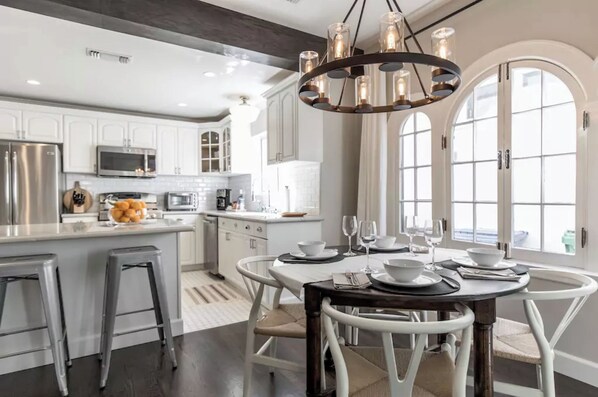 La nuova cucina ristrutturata comprendeva lussuosi piani in marmo e elettrodomestici in acciaio inossidabile. Questa cucina è estremamente ben attrezzata con tutto ciò che avrebbe bisogno di cucinare o intrattenere durante il tuo soggiorno e approfittare del caffè e del tè durante la tua visita. Tutti gli elettrodomestici necessari sono forniti: forno a grandezza intera, lavastoviglie, forno a microonde, forno da tostapane, macchina da caffè elettrica.