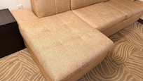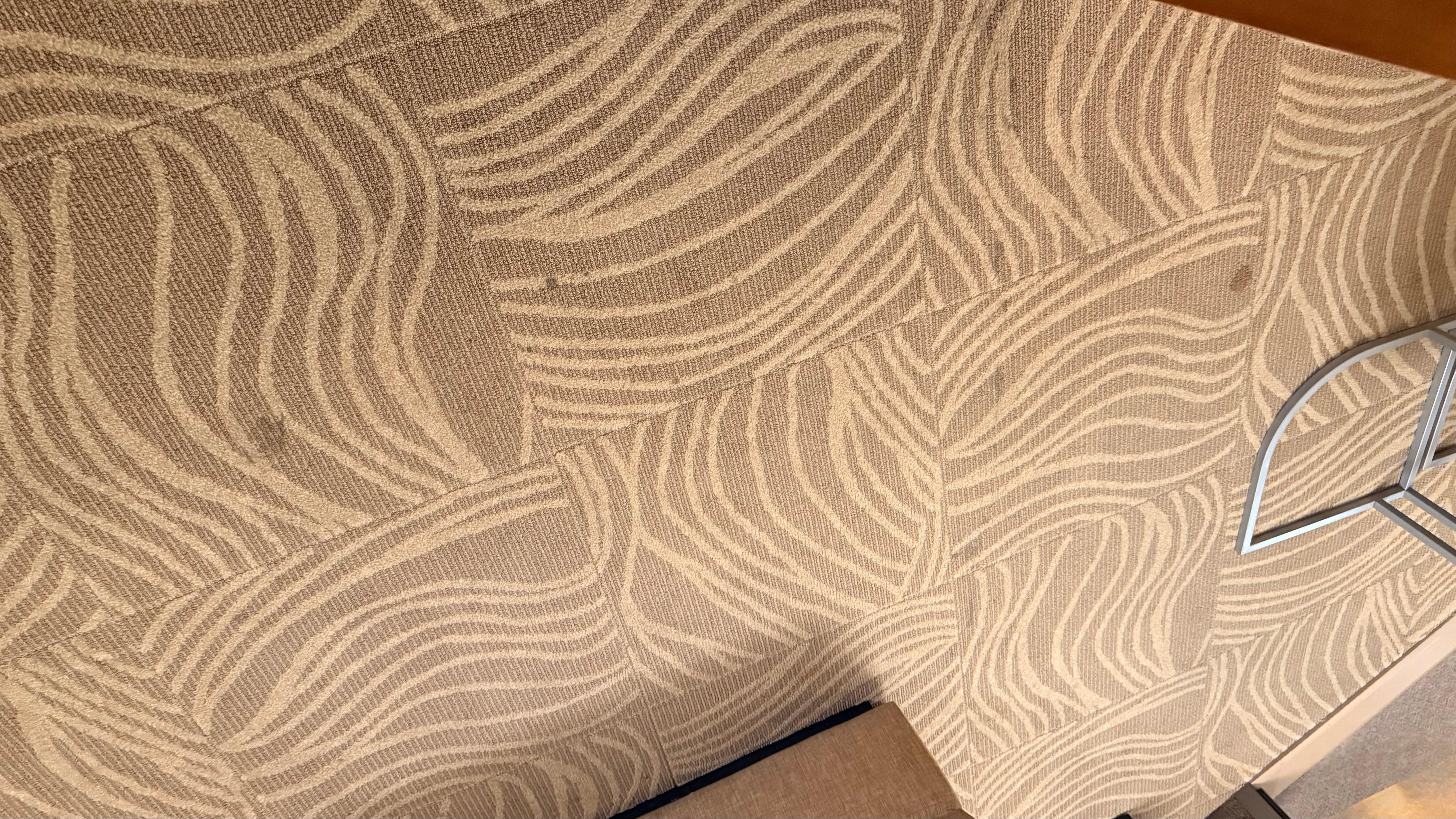 Both rooms showed clear signs of poor upkeep. The carpets appeared dirty, with visible stains, and the couches and lamp shades were also stained. Additionally, the rooms had an unpleasant, musty odor that made the stay uncomfortable.