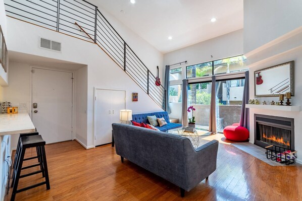 Bright large Living Area w balcony views of courtyard. Plus 55" Roku TV.