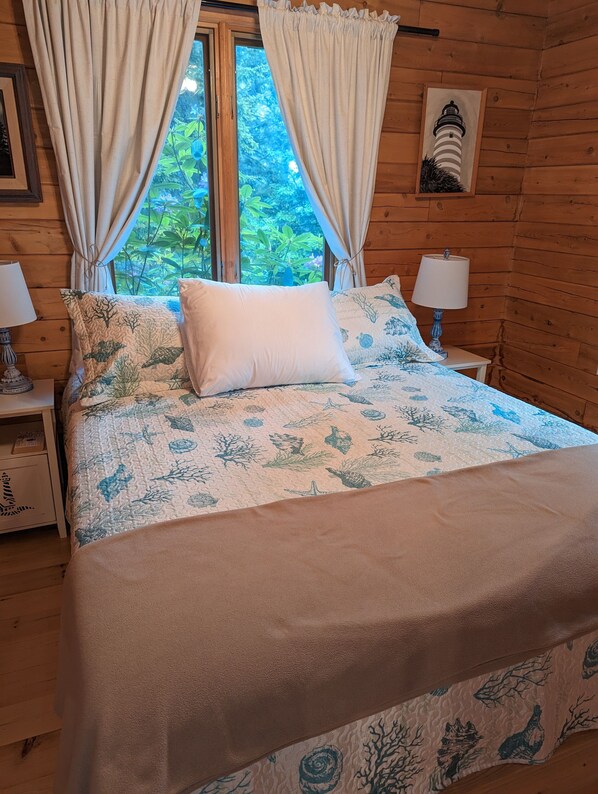 If you are looking for a cute, little, log cabin in the woods, close to a quiet beach, the Lighthouse log cabin is right for you. The cabin is very small, but it has everything that you will need for a relaxing getaway! We have a very reasonable and flexible cancellation policy and do make exceptions when things happen that are unexpected such as family illness or death, accidents, and weather related issues. We offer a 10% active and retired military, law enforcement,and first responders, just message us before you make your reservation and we will add the discount. We have a low $75 cleaning fee, no pet fee, a 10% weekly discount, and a 2 night minimum stay( off peak season)! All dogs are welcome,but we do ask that you keep them on a lead everywhere on the property except for the beach to keep them safe and out of respect for other guests. Also please do not leave your dog alone on the porch or in the cabin to bark and disturb other guests and our neighbors. We work very hard to provide the best value for your money! We have an extremely fast response and resolution time if you have an issue. We care about your family and our team is here to serve you and make sure you have the very best stay possible. This is a very small cabin, so it is suitable for 2 adults and up to 2 young children and small dogs. Very large or very energetic dogs would not have enough room to run around. All well behaved dogs welcome, up to 2 dogs per booking. We accept well behaved cats upon request, too. Because we are pet friendly and the beach is shared with the other cabins you may occasionally see or hear other guests and their pets. If you are allergic or simply do not like pets our cabin would not be a good fit for you. Reserve the perfect dates for next summer, now, because it fills up quickly with repeat guests. There is a stone fire pit, small propane grill,picnic table, and chairs. The Lighthouse has 200Mbps high speed internet and Wi-Fi. The cabin gets the cool breeze off of the bay so there is no air conditioning just baseboard heaters for the cold mornings and nights. The cabin is near the end of the North Lubec peninsula, so the location feels very remote, but is only 6 miles from the town of Lubec. Lubec is paradise for nature lovers, but the restaurants are limited and close early and there is no night life because it is just a small, historic fishing village. The Lighthouse cabin is located about a quarter of a mile off of North Lubec Road down a long gravel road (Lighthouse Lane). The Lighthouse cabin is the 2nd, of 3 cabins, with a little stone bridge out front. The cabin is clean and comfortable and is surrounded by tall trees and birds. Bring your paddle board or use our kayaks and explore the bay. To use our kayaks you must sign the waiver form in the welcome book. There is a kayak rack at the beach, but the beach is slightly downhill from the cabin and so is not ideal if you bring heavy kayaks. The cabin shares access to a quiet beach with two other log cabins. The cabins have trees separating them for privacy. Just follow a short path that start right off from the back porch to get to the beach and the kayak rack. Guests staying at the last cabin are aware that guests from the other cabins will be walking the path to get to the beach. This cabin gets its name from the Quoddy Head lighthouse that is a 9.7 mile drive away. Quoddy head's coast guard hiking trails are not to be missed, and other short hiking trails and picnic areas are 10 minutes away on North Lubec Road. We highly recommend the Down East Charters whale watching tours (they run from mid-June too mid-September) from Lubec, the guide is knowledgeable and funny and touring the coastlines of neighboring islands is breathtaking. The Lighthouse log cabin is all on one level and has 2 bedrooms and a small open concept kitchen with a dishwasher, a table, and a small living room space. The screened porch is great for enjoying the cool, salty, breeze and the sound of birds and the tide coming in. There is a washer and dryer and a full bath with a tub shower combo. Outdoor chairs, picnic table, small propane grill, and a stone fire pit, are provided. This is not a beach for swimming. The current is too strong and the water is always too cold. No smoking and please return all TV equipment to its original settings if you make any changes.
