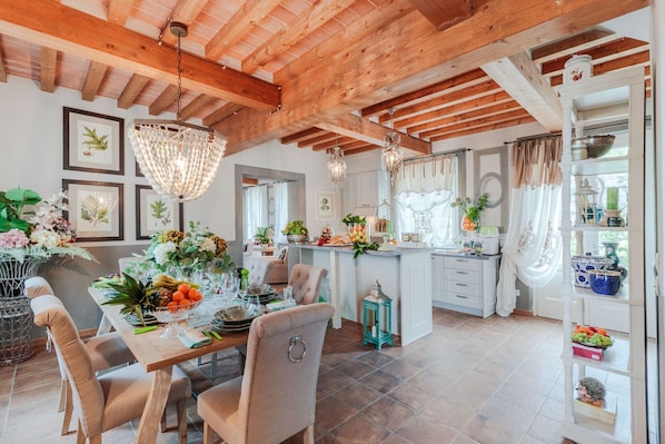 Originally a farmhouse, the villa has been fully restored to preserve its stone walls and beamed ceilings, but the furnishings add a modern twist. In the living room, neutral sofas, soft chairs in grey linen and a traditional-style wooden coffee table cluster around the cosy fireplace (not usable). The dining room is fresh and simple, with wooden chairs, warm white walls and plenty of light from the large windows. In the fully equipped kitchen, a striking wood island makes a roomy work space or handy serving station.