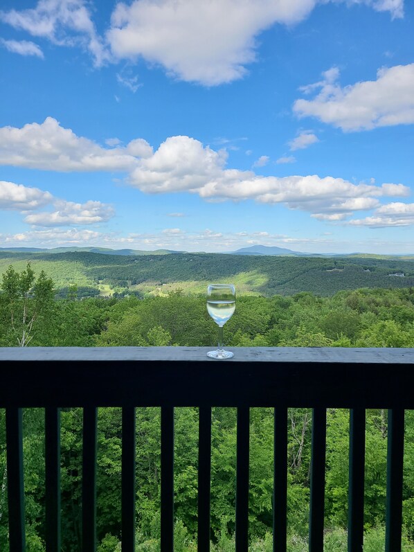 Inside, you'll be able to fit eight people in three sleeping areas. The master bedroom has a king bed, a second bedroom has two bunk beds (one a twin/twin and the other a twin/double) that will sleep five, and the upstairs loft has a queen size bed. There are two nicely equipped bathrooms with rain shower heads downstairs. The kitchen is fully equipped with all utensils, cookware, stove, refrigerator/freezer, microwave, coffee maker and toaster oven. The family room has a large table, a counter with seats and a cozy family room with recliners, fireplace and massage chair. In the entrance way, you'll find a bench to put on your ski boots, closet space, a boot warmer and a washer/dryer. The family room, bedrooms and loft all have smart TVs with applications and cable channels. There is wireless internet throughout and a deck with amazing views, too!