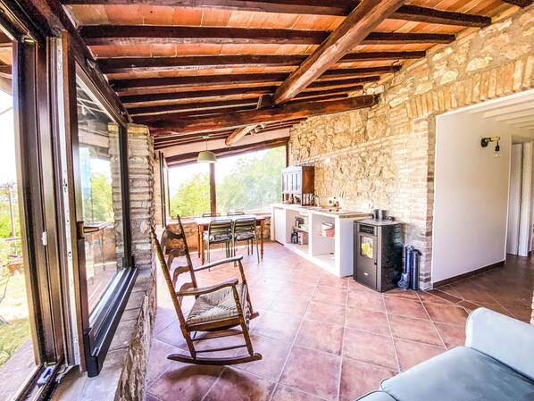 2 terrazze ed 1 portico con sedie e tavoli per mangiare all'aperto