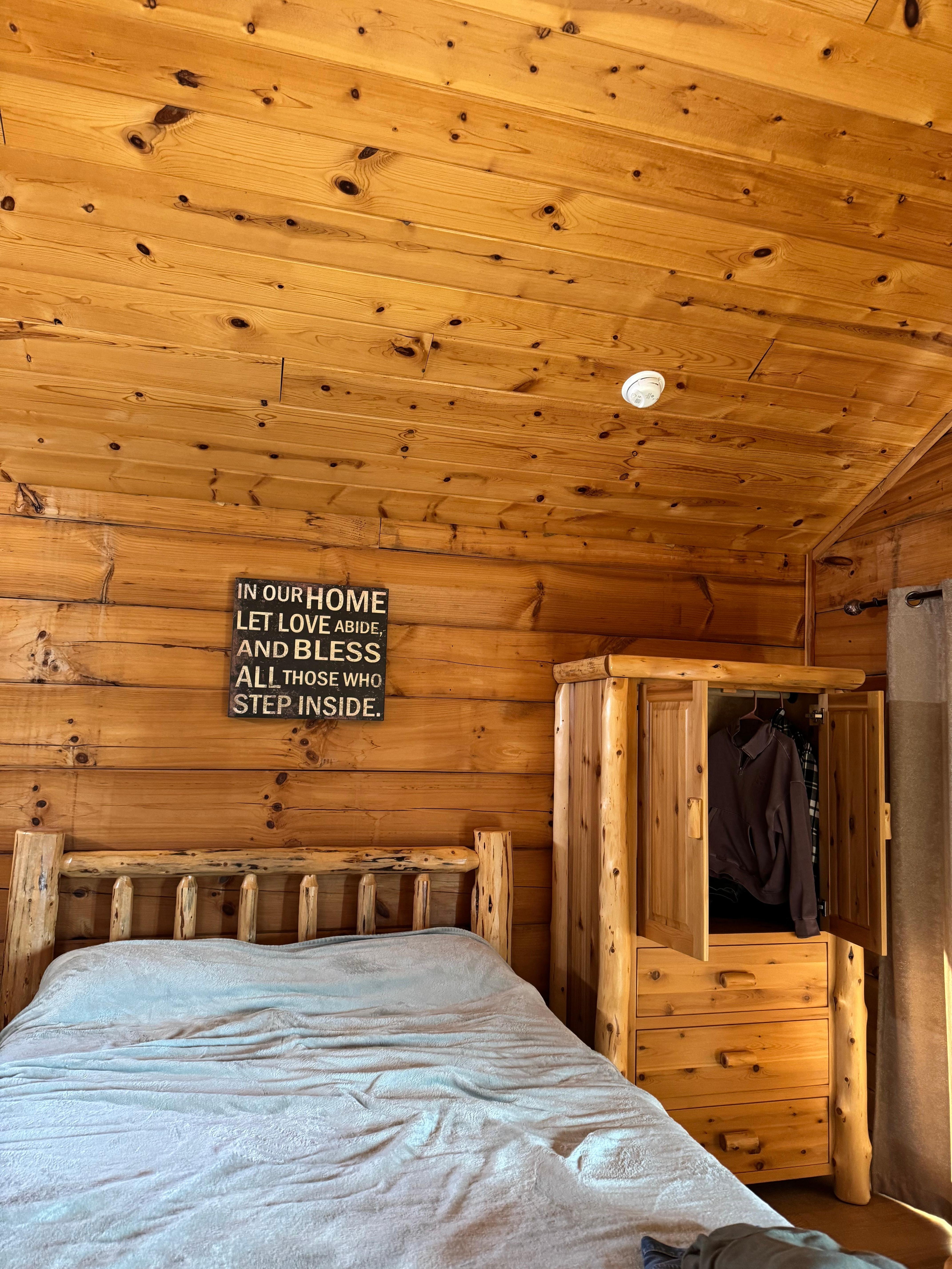 La baita # 6 di Hawksbill Retreat con 1 camera da letto è progettata per una fuga romantica di coppia. La cabina dispone di un open space con un bagno privato per 2 persone con piastrelle personalizzate. Le ampie porte-finestre in vetro ti consentono di ammirare le viste sulle Blue Ridge Mountains dal tuo letto queen size. Il portico coperto è l'ideale per godersi la tua tazza di caffè preferita mentre ti godi la vista tranquilla delle Blue Ridge Mountains. La cabina è dotata di vasca idromassaggio privata, cucina completamente attrezzata, doccia per 2 persone con piastrelle personalizzate, griglia a carbone all'aperto, focolare all'aperto, TV satellitare, internet WIFI e camino.