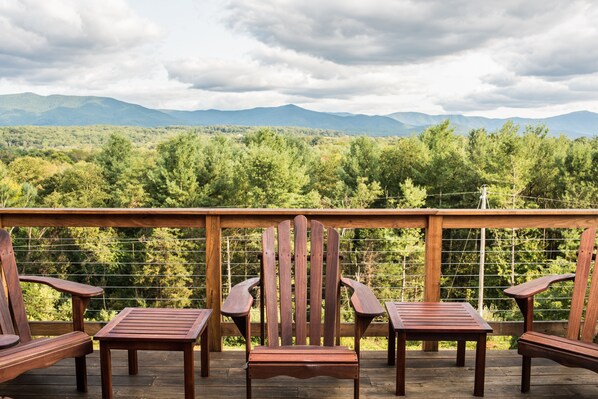 Il risultato di coronamento è il ponte di legno duro di locuste al secondo piano. Con sei sedie Adirondack, godetevi la vista con una bevanda fredda (apribottiglie ai lati). Le albe e i tramonti sono inestimabili. Dal momento che siamo così lontani dalle luci della città, avrai quella rara occasione per una notte di stelle tranquilla che guarda.