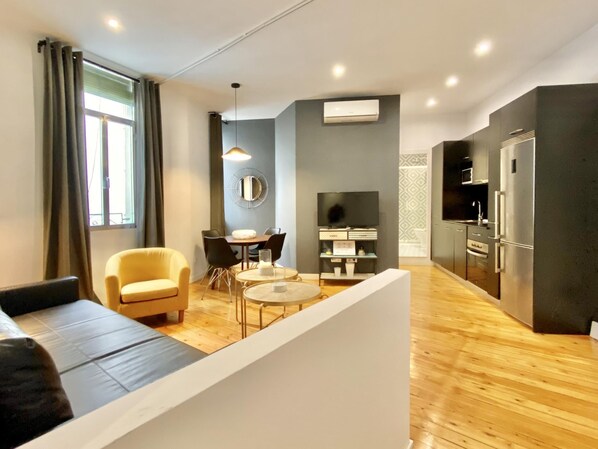The living area features a comfortable sofa and a flat-screen TV, ideal for relaxing and watching your favorite shows or movies after a long day of work or study in Madrid. The fully equipped kitchen includes a ceramic stovetop, oven, refrigerator and freezer, dishwasher, microwave, washing machine, Nespresso coffee machine, toaster, kettle, and all the necessary cookware and tableware to make you feel at home.