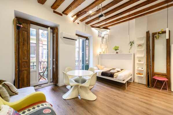 The studio also has a balcony, which provides natural light and a pleasant outdoor space.