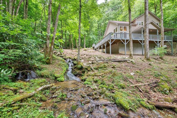 The relaxing tone of your vacation begins with the ever-present sound of the babbling creek that runs through the yard. Wake up to a cup of coffee at the kitchen bar and greet the day with birds singing in the forest. Floor-to-ceiling windows let tons of light into the house all day. Spend family time together seated at the beautiful live edge dining table. The convenience of being able to make your favorite meals while on vacation is unbeatable! Cool mountain nights are perfect for cozying up by the gas fireplace to enjoy a movie. The main level primary bedroom is private with a full bath, and the upper level offers a home office area along with a second bedroom and full bath. Cherish the peacefulness of a nature-inspired getaway without having to sacrifice close proximity to all of the attractions and conveniences in the destination town of Maggie Valley. Kids love to stay at Woodland Escape, especially reading the book collections and finding quartz in the waterfall pools! Take a break on the bench by the fire pit and enjoy peek-a-boo mountain views in the winter and wooded privacy in the summertime. A covered deck overlooking the creek offers a great spot to get outdoors rain or shine. Discover a serene Smoky Mountain getaway at Woodland Escape! This Asheville vacation rental is located in Maggie Valley and is approximately 48 minutes to downtown Asheville.