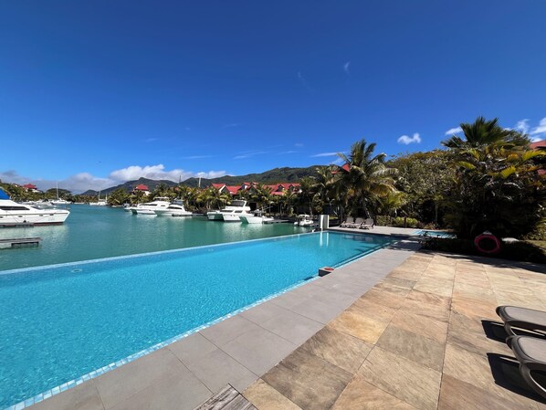 Palm trees, straw-covered sun umbrellas and the scenery of the mountains of Mahé in the background. Relaxation for body and soul from the first second on. Most exclusive location on Eden Island, in a small block of 12 apartments, comprising of ground-floor and first floor only.