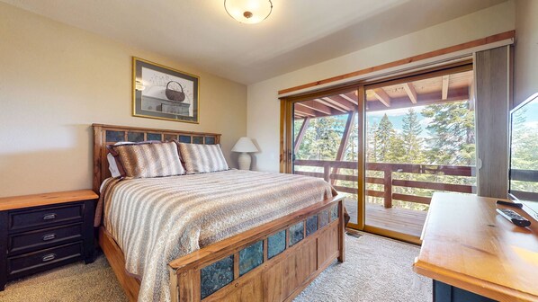 The master bedroom features a Queen bed, attached private bathroom with double