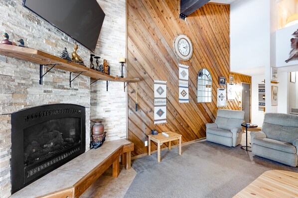 Stylish and perfectly located, this Mammoth Lakes retreat is more than ready to assist in making the best memories regardless of the season. Upon entering this home away from home, you will immediately be greeted by the high ceilings, wood panel accents, and expansive fireplace that make this condo feel like your own secluded cabin while still having all of the modern touches that you would expect from a high-end getaway. After a full day of lake adventures or skiing to your heart's content, step out to the private balcony with a glass of wine or favorite cocktail, and breathe in the crisp mountain air. When everyone builds up an appetite, the chef of the group will love hopping into the fully equipped kitchen and the adorable dining nook will accommodate everyone for a meal enjoyed together. Not to mention, the flatscreen TV, shared pool and hot tub, and three spacious bedrooms will provide even more entertainment!