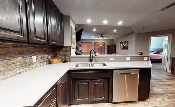 This fully furnished condo features a bright and open living room with fireplace and television, full kitchen with bar seating and breakfast nook, offering plenty of room to relax. The kitchen is fully stocked with everything you need to make meals at home.
