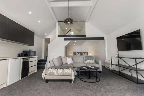 Bedrooms: The ground level hosts a luxurious and comfortable king bed, while the mezzanine floor features two loft single beds, all equipped with plush hotel quality linen and pillows, guaranteeing guests the ultimate sleeping experience.