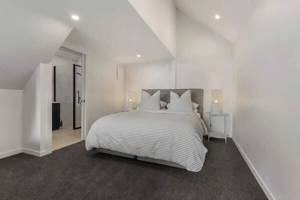 Bedrooms: The ground level hosts a luxurious and comfortable king bed, while the mezzanine floor features two loft single beds, all equipped with plush hotel quality linen and pillows, guaranteeing guests the ultimate sleeping experience.
