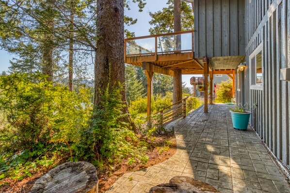 Located five blocks from the gorgeous Pacific Ocean and pristine sand, this lovely and spacious home boasts south/west-facing views of the mountains and blue waters. Two sunlit floors present and a bonus loft provide ample room to both relax and entertain. Outside, enjoy beautiful landscaping with a large, sunny deck with views, or make your way to the spacious concrete patio with an accommodating picnic table perfect for outside entertainment! On the main level, you'll find an open floor plan with gorgeous bamboo floors, a cozy wood-burning stove, and an immaculate kitchen with a breakfast bar, fitted with stainless steel appliances and plenty of cookware. Dine together at the six-person table with views of the forest, mountains, and peeks of the ocean!