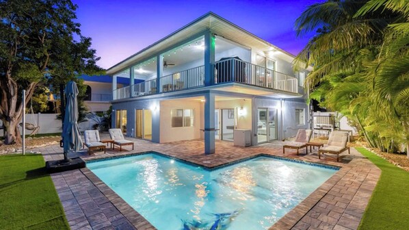 Enjoy a private, resort-style vacation home ideal for a short-term escape! This beautiful property boasts a custom in-ground pool equipped with heating, cooling, lighting, and a swim platform, all set amid vibrant tropical plants and a low-maintenance turf yard. Experience total privacy thanks to abundant greenery, a charming garden path, and a secure privacy fence. Boating enthusiasts will love the dock that fits boats up to 28 feet, providing easy access to prime fishing locations. Inside, the roomy residence offers 5 bedrooms, 3 bathrooms, and a contemporary kitchen featuring stainless steel appliances and granite countertops. Unwind on the covered back balcony with views of the pool, yard, and canal. Conveniently situated near shopping, dining, bike trails, and beaches, this rental also includes smart TVs (no cable) for your streaming enjoyment. Reserve now for an unforgettable tropical getaway!*Please note: The boat lift is not available for guest use.