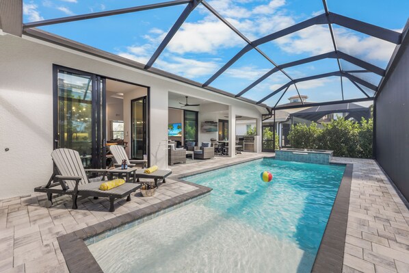Pulling into the arched, palm-lined driveway, you’re greeted by your very own tropical castle. The moment you step through the front door, the stunning view of the lanai calls to you. Out there, a private oasis awaits. Splash around in the heated pool, luxuriate in the hot tub or on the sun loungers, or enjoy a movie on the outdoor television. You’ll never have to worry about lunch—an outdoor grill and full kitchen are ready for your next barbecue. As the sun sets, the lanai’s western exposure provides the perfect front-row seat to Marco Island’s brilliant orange skies.