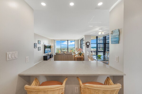 Si tratta di un'unità di ala sul lato dell'edificio, con un balcone che si affaccia sull'oceano e un secondo balcone che si affaccia su Marco Island. Goditi il tuo caffè mattutino con uno sfondo di sole che sorge sopra i canali blu fiancheggiati da palme. Poi prendi la tua seconda tazza di caffè con uno sfondo di oceano turchese e lagune circondate da mangrovie. Molto presto, farai lo snorkeling in quell'acqua limpida, o camminerai lungo le sabbie di seta alla ricerca di conchiglie colorate, o forse esplorerai su paddleboard o trampolini.