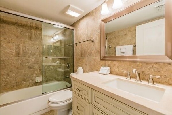 The condo is well appointed with a king bed in the master with in-suite bathroom with walk-in shower and dual sinks. The guest bedroom has 2 full beds and an adjacent bathroom with single vanity and tub and shower combo as well as a flat screen TV. The living room is decorated in warm colors and has comfortable seating and a large flat screen TV.