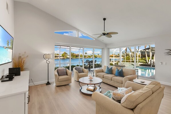 Tall ceilings welcome you to your impressive open living space with great views of the dock, cerulean channel complete with indirect gulf access, and private pool. Two couches and a great TV offer a place to sink in and truly relax.