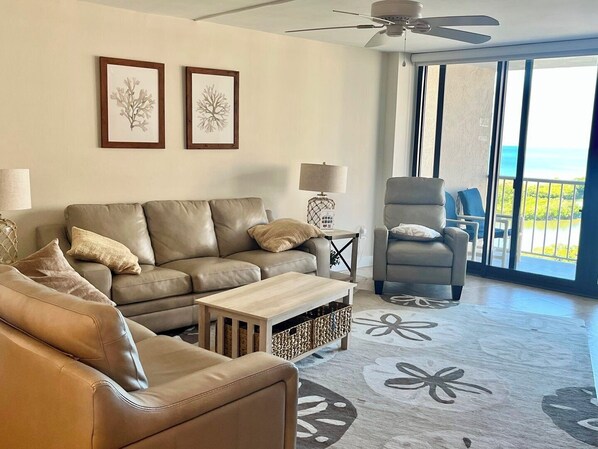 This beautifully updated condo is located on the 12th floor and has amazing views of the gulf, pool and city. During the day time you can enjoy relaxing on the balcony and in the evening enjoy the beautiful sunsets. Kitchen has granite countertops and stainless steel appliances. The dining room table seats four guests comfortably and the breakfast bar seats two. The living room has ample seating with a sofa, loveseat and an arm chairs.