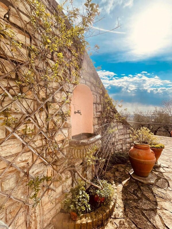 Al primo piano si trova l’ampia terrazza ad archi da dove si può godere del meraviglioso panorama sottostante mentre si mangia all'aperto sul grande tavolo del suo salotto esterno, attraverso questo si accede poi al salone interno e alla zona notte dotata di due grandi camere matrimoniali, una con bagno privato interno, e l'altra con un letto singolo aggiuntivo e bagno con vasca oltre ad una camera con un letto matrimoniale alla francese.