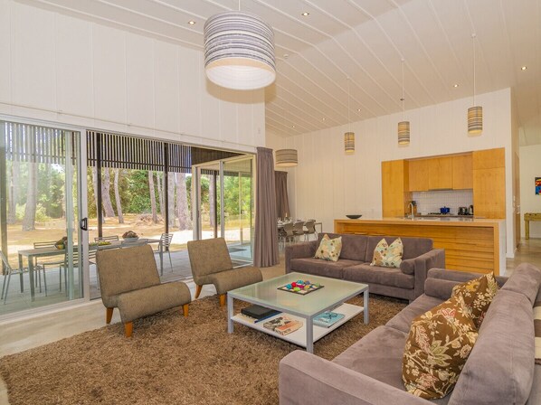 Nascosto sotto i pini e a meno di 100 metri dalla spiaggia - Benvenuti al Golden Hideaway! Questa casa vacanze si trova su un mezzo ettaro di terra nella spaziosa area dei Pini di Matarangi. La spiaggia è accessibile tramite una passerella che è immediatamente di fronte alla casa e sarai a soli 200 metri dai campi da tennis e dal golf club. Il Golden Hideaway dispone di quattro camere da letto, due bagni e un moderno open space soggiorno, sala da pranzo e angolo cottura. Le ampie verande pavimentate, anteriore e posteriore, mantengono la casa fresca in estate e forniscono aree ombreggiate per barbecue o pranzi all'aperto. Il salotto e la sala da pranzo sono a pianta aperta con alti soffitti a battente, pavimenti in cemento lucidato, un grande tappeto sul pavimento, camino aperto e porte scorrevoli che si aprono sulle verande anteriore e posteriore. Il salone ha 2 divani 3 posti, 2 poltrone, una TV a schermo piatto e un lettore DVD / CD (portare il proprio decoder Sky). La sala da pranzo ha un grande tavolo rettangolare bianco con 8 sedie - perfetto per tutta la famiglia. La cucina è caratterizzata da una panca isolana lunga 3 metri. Ci sono 3 sgabelli da bar per pasti informali in panchina. Gli elettrodomestici includono un forno, piano cottura (gas), rangehood, frigo / congelatore, frigo bar, forno a microonde, lavastoviglie, wastemaster, frullatore, macchina per il pane, grill sandwich, brocca elettrica e tostapane, e pentole, padelle, stoviglie e pentole di buona qualità posate. Tutte e quattro le camere sono doppie; due camere da letto hanno letti queen size e due camere da letto hanno due letti king size. Tutte le camere sono dotate di moquette, tende in tessuto, armadi e materassi a molle. Tre camere da letto hanno porte scorrevoli che si aprono all'esterno sulla veranda. I due bagni hanno pavimenti piastrellati, docce piastrellate, servizi igienici a muro e lavandini, portasciugamani riscaldati e specchi riscaldati. Un bagno ha un bagno. L'altro contiene il bucato, tra cui lavatrice e asciugatrice. C'è un ferro e asse da stiro. I mobili per esterni disponibili comprendono un grande tavolo da pranzo in cedro / acciaio zincato, sei sedie, alcune sedie a sdraio e sacchi di fagioli e un barbecue a gas. C'è una doccia esterna (calda e fredda) per il risciacquo dopo la spiaggia. Il ripostiglio esterno contiene boogieboard e alcune vecchie biciclette, che gli ospiti sono invitati a utilizzare. Rendi la tua avventura Matarangi indimenticabile - The Hideaway d'oro ti aspetta! Bachcare fornisce servizi di pulizia e biancheria che possono essere addebitati dopo la prenotazione. Se la pulizia o la biancheria non compaiono sul preventivo su HomeAway, NON è INCLUSO nel soggiorno. Per saperne di più sui prezzi specifici per la pulizia e la biancheria per il vostro soggiorno, si prega di utilizzare il "Fare una domanda al gestore" per contattare Bachcare. Altre cose da notare: per aiutarti a goderti l'ultimo giorno e garantire che la proprietà sia in ottime condizioni per ogni ospite, a questa proprietà si applica una pulizia di partenza obbligatoria. La tariffa è aggiuntiva alla tariffa notturna e il prezzo è disponibile al momento della prenotazione, in base alle dimensioni del gruppo. Nascosto sotto i pini e a meno di 100 metri dalla spiaggia - Benvenuti al Golden Hideaway! Questa casa vacanze si trova su un mezzo ettaro di terra nella spaziosa area dei Pini di Matarangi. La spiaggia è accessibile tramite una passerella che è immediatamente