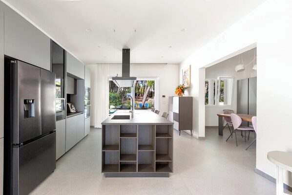 Casa del Pino è una grande villa vacanze dal design contemporaneo, dotata di piscina e attorniata da pineta: un luogo incantevole dove trascorrere le vacanze nel Salento, coccolati dai più moderni agi. L`esclusiva dimora per vacanze luxury sorge a Matino, situata in zona residenziale a ridosso di una spettacolare pineta verde e profumata. La villa ha ampi spazi esterni attrezzati con piscina e solarium, barbecue, doccia esterna, area pranzo esterna, 2 stazioni di ricarica per auto elettriche, impianto di videosorveglianza etc. Tra gli accessori della villa ci sono: aria condizionata, internet wi-fi, lavatrice, asciugatrice, asse e ferro da stiro, phon, smart tv, parabola satellitare, cassaforte, cucina ben equipaggiata etc. La villa vacanze Casa del Pino offre fino a 15 posti letto. Sono ammessi animali. Casa del Pino, villa di lusso con piscina e pineta a Matino nel cuore del Salento Casa del Pino è caratterizzata da design contemporaneo e dall`architettura che sfrutta le pendenze naturali della zona per creare una dimora dal fascino elegante. La dimora si sviluppa, infatti, su due livelli con accessi indipendenti, ed offre ambienti raffinati e completi di ogni comfort. La villa al primo piano è composta da 2 camere matrimoniali con bagno en suite, 1 camera singola, 1 bagno doccia, ampio salone con mobilia di alto design e pianoforte a coda, una grande cucina con piano cottura su isola, comunicante con il soggiorno. Su questo piano, all`esterno, c`è la grande piscina con prato inglese, lettini per il solarium, barbecue mobile e accesso diretto alla pineta. Al piano terra c`è la seconda parte della villa, formata da 3 camere matrimoniali con bagno en suite, 1 camera singola con pouf letto, ampio soggiorno con 1 pouf letto singolo, un bagno completo con accesso dal soggiorno. Accanto a questa unità c`è un monolocale, disimpegnato rispetto al resto del piano, in cui ci sono cucina completa, 1 divano letto matrimoniale e 1 bagno doccia. Casa del Pino, con il suo giardino completamente recintato e la vegetazione d`intorno, garantisce relax, tranquillità e privacy. I dintorni di Casa del Pino a Matino Casa del Pino sorge in zona residenziale a Matino, in un`area dove le ville di lusso e le residenze esclusive godono di un panorama autentico e verdeggiante. Il centro di Matino, così come quello della vicina città di Casarano, dista meno di 2 km. Le spiagge più vicine sono quelle di Punta della Suina e Baia Verde, sul litorale di Gallipoli, distanti circa 15 km.