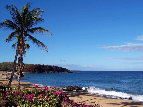 Our 1000-square-foot (includes lanai) one-bedroom vacation rental condominium is located overlooking the eighth fairway of the Kaluakoi Golf Course (closed 4/2008) with unspoiled views of Pãpõhaku Beach (three-mile beach), Kepuhi Bay, the natural terrain, and those famous Hawaiian Sunsets and spectacular moon settings. This downstairs (no stairs) unit offers one of the best views in Ke Nani Kai. These views can be enjoyed from the lanai, kitchen, living room/dining room, or the bedroom while standing, sitting, or stretching out!