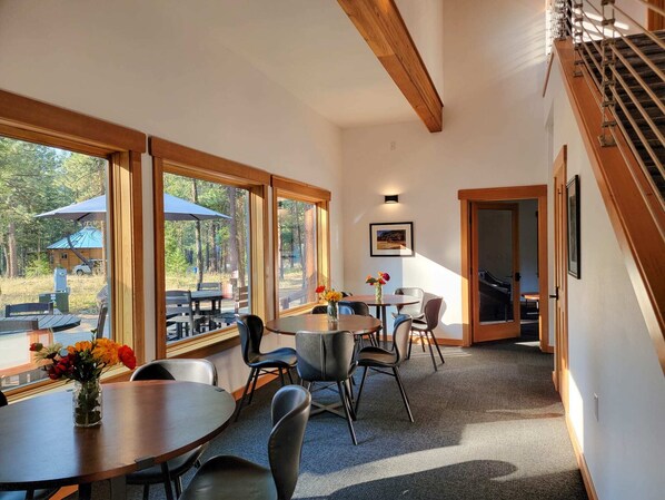 Our restaurant is currently closed until further notice; breakfast is NOT included. Guests can use the Clubhouse kitchen and BBQ to prepare your own meals, and we are steps from the Mazama Store with its bakery, and the Mazama Public House serving lunch and dinner daily.