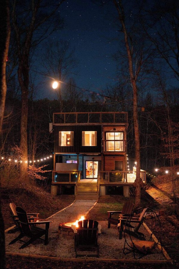 Stay in a one-of-a-kind 3-story container home set above a flowing creek. This 3-bedroom retreat sleeps up to 10 with a queen pull-out—perfect for families or groups. Enjoy a rooftop deck with games, private hot tub, pool table, and fire pit. Surrounded by nature yet equipped with Starlink WiFi and A/C, it’s a peaceful, private escape with relaxing water views.