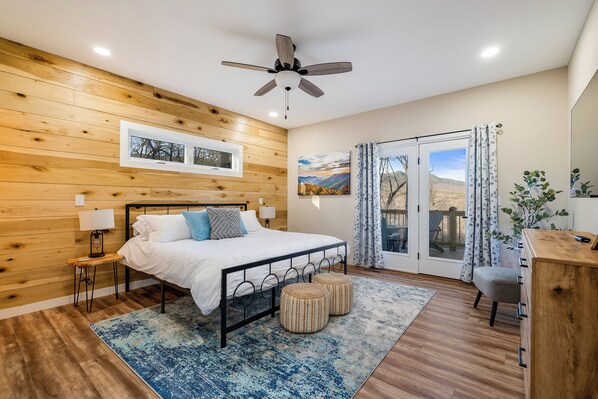 • Bedroom 1 (the mountain room, sleeps 2) features a king size bed, Roku TV, and stunning mountain views.
