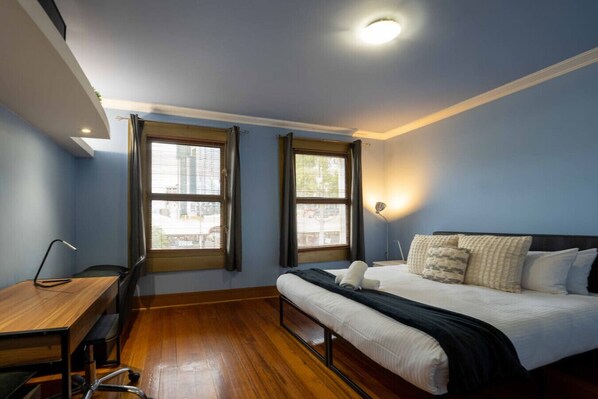 Each bedroom room is thoughtfully furnished with quality beds, fresh linen and a desk in case you need to work and a heater. > Bedroom 1 - King bed x (sleeps 2) > Bedroom 2 - Single bed x 2 (sleeps 2) > Bedroom 3 - Single x 1 (sleeps 1) > Bedroom 4 - Upstairs loft single x 1 (sleeps 1) > Two bathrooms. One with a large corner bath to chill in and rest the weary legs after a day of exploring the city.