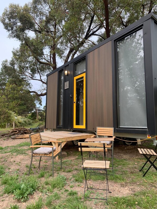 Enjoy walk tracks, a fire pit, and fruit trees laden with pears, plums, nectarines, and blackberries. It's one of the region’s unique holiday homes, it’s the perfect place to unwind, explore, and reconnect with nature. #TinyHouseVictoria #HolidayHomes