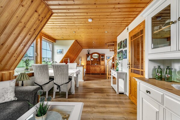L'appartamento (50 m²), accogliente e arredato in stile contemporaneo, si trova al piano superiore ed è adatto per 2-4 persone. Il soggiorno è dotato di divano, TV satellitare, accesso a Internet, telefono, zona pranzo e un letto da giorno aggiuntivo. L'angolo cottura è dotato di tutti gli elettrodomestici necessari. La camera da letto separata, con una splendida vista panoramica, è raggiungibile tramite una scala a chiocciola e si trova a un piano superiore. Le biciclette sono disponibili gratuitamente.
