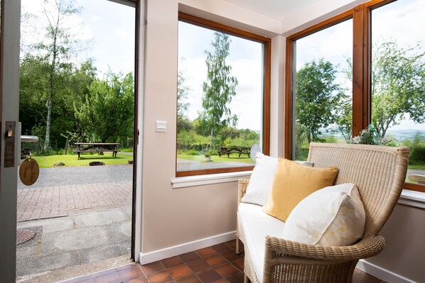 Sempre al piano terra c'è una cucina open space / sala da pranzo / soggiorno e un portico di sole nella parte anteriore, che è un bel posto per sedersi e leggere con un caffè o per guardare gli uccelli che si nutrono di mangiatoie per uccelli appesi in giardino. È anche un posto comodo per lasciare asciugare cani e stivali bagnati se necessario.