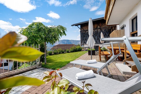 - Una grande terrazza con giardino privato e splendida vista verso sud sull'Alto Adige (dotata di lettini, ombrellone e tavolo da pranzo).