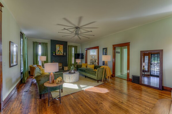 This bright, open concept living room is designed to make you feel instantly at home. With plush green velvet sofas, cheerful yellow accents, and natural wood floors, the space combines mid-century charm with modern flair. It has a Smart TV and games for cozy nights in. Oversized ceiling fan to keep the space cool and breezy. Artistic touches and a decorative fireplace that give the room personality