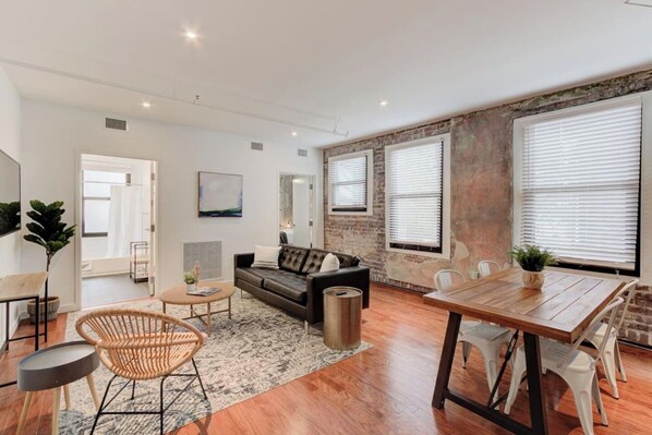 Stay in this beautifully restored historic Main Street building, where exposed brick walls meet modern design and comfort. Fully renovated from top to bottom, this 2nd-floor apartment offers a warm, welcoming retreat in the heart of downtown Memphis. With a restaurant conveniently located downstairs, everything you need for work, relaxation, or exploration is right at your doorstep.