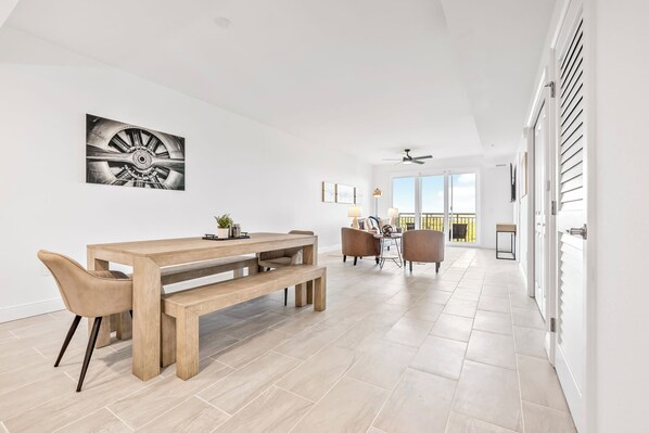 Indulge your culinary tastes in the expansive, fully equipped kitchen complete with brand new top-of-the-line appliances and sleek finishes. Gather around the spacious dining table to enjoy your culinary creations while enjoying the company of loved ones. Afterward, unwind in the inviting living room, equipped with a 65-inch TV and ample seating for everyone to unwind and entertain.