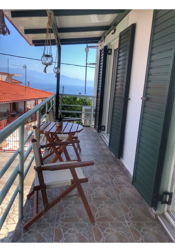 It is a quiet 40 sq.m. space located 1.5 km from the sea. A mini market and an ATM are just 5 minutes away, and a traditional bakery is only 20 meters away. It features a veranda, garden, and free parking space.