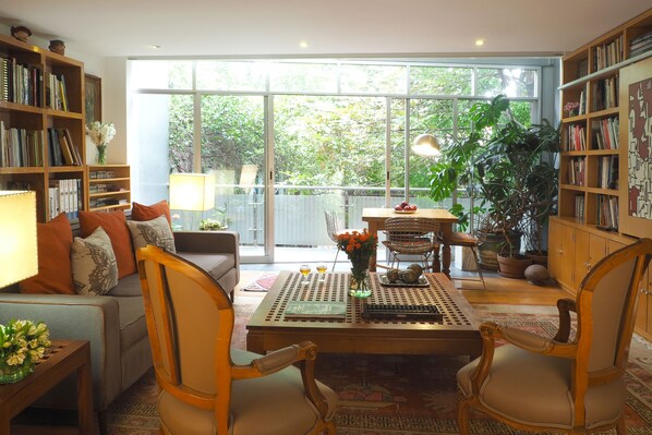 Just by opening the door, the space amazes you with two levels connected by an internal staircase and art gallery vibes. Everything around is unique: an eclectic décor, shelves with plenty of books, antiques, masks, art, and more art... you're in a home full of stories. And, what about the big windows, the beautiful natural light, and a view that will make you feel in a forest!