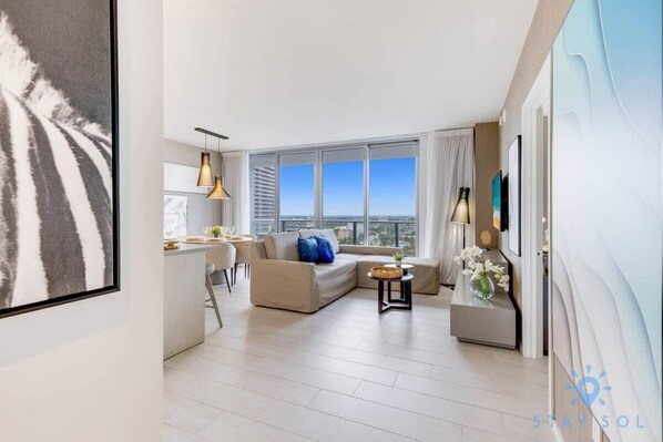 Il nuovissimo resort di lusso LUXURY della Florida meridionale si affaccia sul luccicante Oceano Atlantico. Perfetto per una vacanza di coppia, la nostra ben arredata 1 camera da letto mescola legno naturale e pietra con trame organiche e tecnologia all'avanguardia. C'è un letto matrimoniale nella camera matrimoniale con bagno completo e c'è un divano letto estraibile nella zona soggiorno. I punti salienti includono terrazze private arredate, cucine completamente attrezzate con elettrodomestici in acciaio e lavatrice / asciugatrice in suite.
