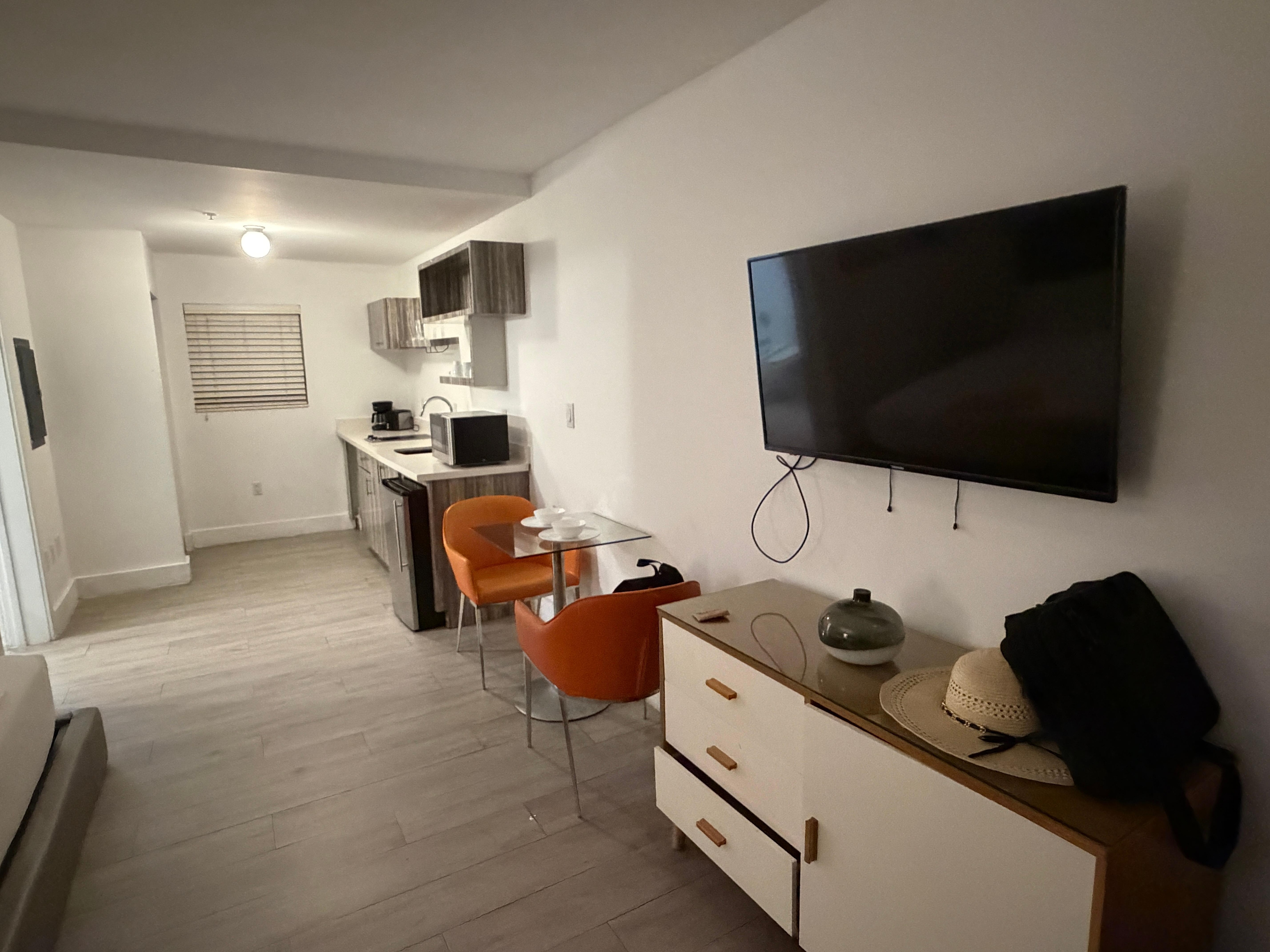 Cracked floor tile in living room hidden under long rug. Check in was in a completely different building so you either have to uber to your room or walk like 10 minutes. Air conditioner in the room was crazy loud like something was stuck in it or about to break. Only stayed one night. Otherwise it wasn’t bad or anything, just inconvenient to check in a different building.